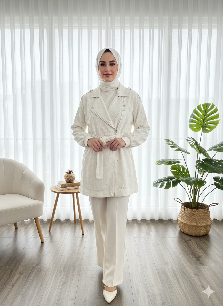 A light blue and white striped long jacket or coat featuring a wide, notched collar, an asymmetrical zipper closure, and a matching belt with a buckle. The sleeves are long and slightly gathered, offering a chic, relaxed fit. It is worn over a solid white top.