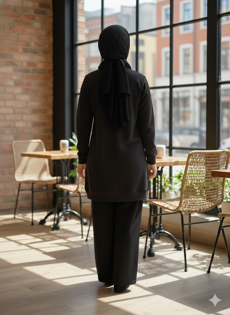 A sleek, all-black matching set featuring a long zip-up tunic and wide-leg trousers. Perfect for polished, everyday style.