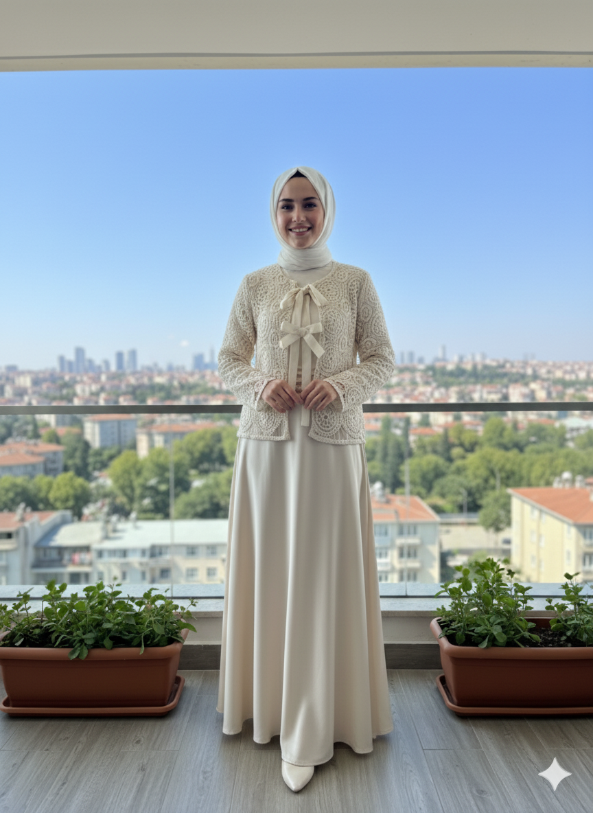 Make an unforgettable entrance with the Seraphina Bow-Tie & Skirt Ensemble. This exquisite two-piece set is designed for life's most beautiful moments. It features a stunning, textured lace-knit jacket, centered with a dramatic and elegant bow tie. This is paired with a gracefully flowing, A-line maxi skirt crafted from a smooth, lustrous fabric. Together, they create a look of timeless sophistication and romantic charm.